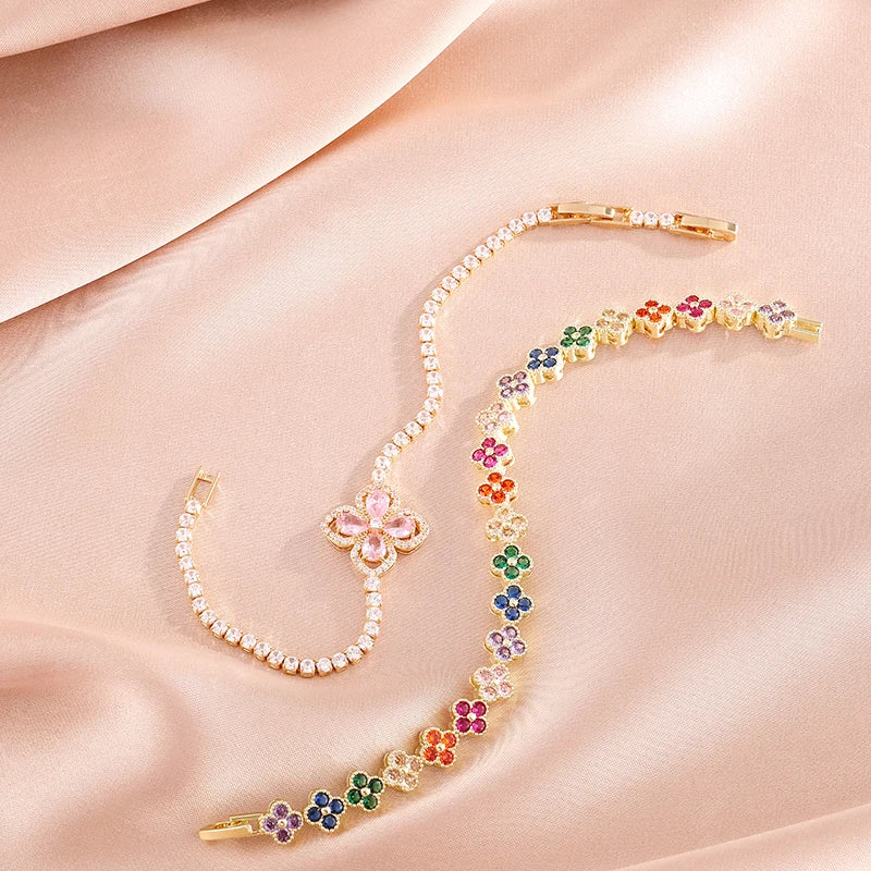 This fashionable and sweet bracelet features delicate flower designs adorned with sparkling zircon stones, creating a charming and elegant look. Perfect for women who love feminine and stylish jewelry, this piece adds a refined touch to party and banquet outfits. Its graceful floral accents and radiant shine make it a beautiful accessory for special occasions or elegant evening wear.