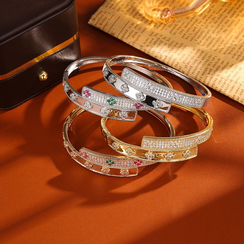 This luxurious and exquisite bracelet features a beautifully crafted flower design adorned with sparkling zircon stones. Made from high-quality copper, it offers a refined shine that enhances any outfit with elegant charm. Perfect for women who enjoy fashionable jewelry, this bracelet is ideal for travel, parties, and banquets—adding a touch of sophistication to both casual and formal looks.