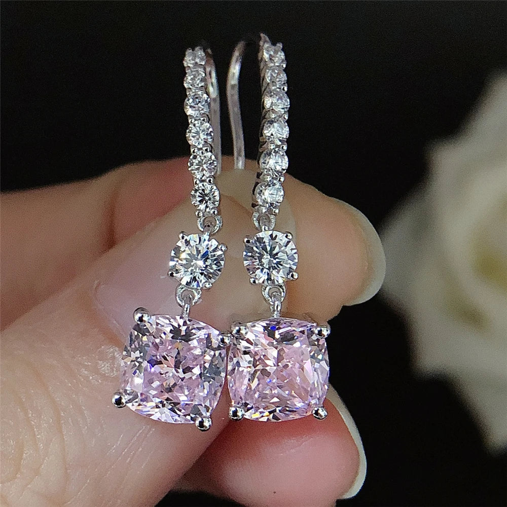 These exquisite drop earrings are crafted from pure white gold (AU750) and feature dazzling 2CT pink diamond–style stones in each piece. Designed to radiate elegance and romance, they make a breathtaking choice for engagements, weddings, and anniversary celebrations. With their graceful drop silhouette and brilliant sparkle, these earrings offer a luxurious and feminine touch that complements both formal and modern fashion styles.