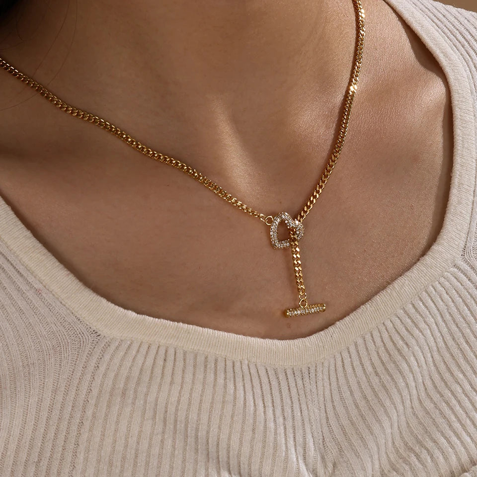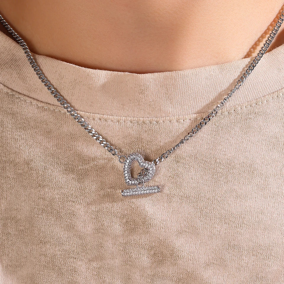 This romantic and sweet necklace features a delicate love-themed design adorned with sparkling zircon stones, creating a soft and elegant shimmer. Perfect for women who enjoy feminine and fashionable jewelry, it beautifully complements party outfits and banquet looks. With its graceful charm and refined shine, this necklace adds a touch of sophistication to both formal and stylish evening ensembles.